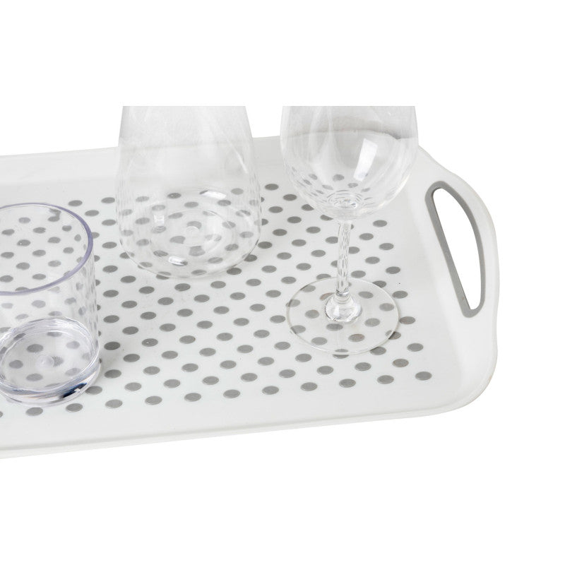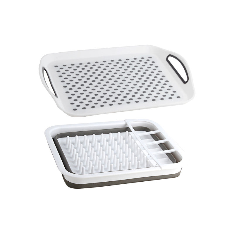 Egouttoir à vaisselle pliable avec plateau blanc et gris.