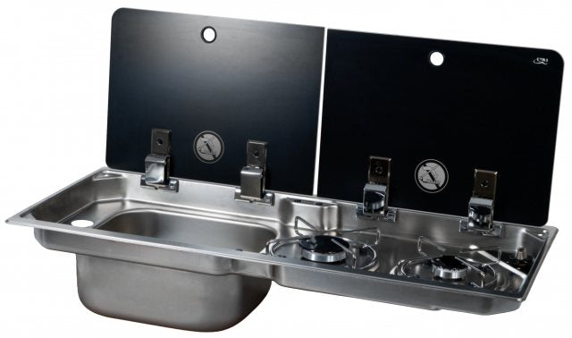 Le FL1922L-P-W est un combiné cuisson et évier en inox conçu pour les camping-cars et aménagements mobiles. Il intègre deux brûleurs gaz et un évier positionné à gauche, protégés par des couvercles en verre trempé noir avec charnières anti-vibrations. Il permet d'optimiser l’espace de votre véhicule tout en offrant une finition soignée.