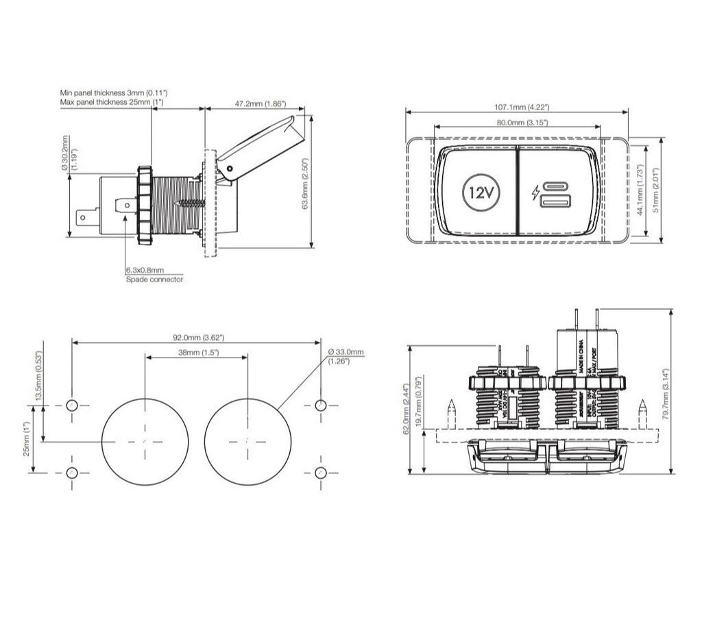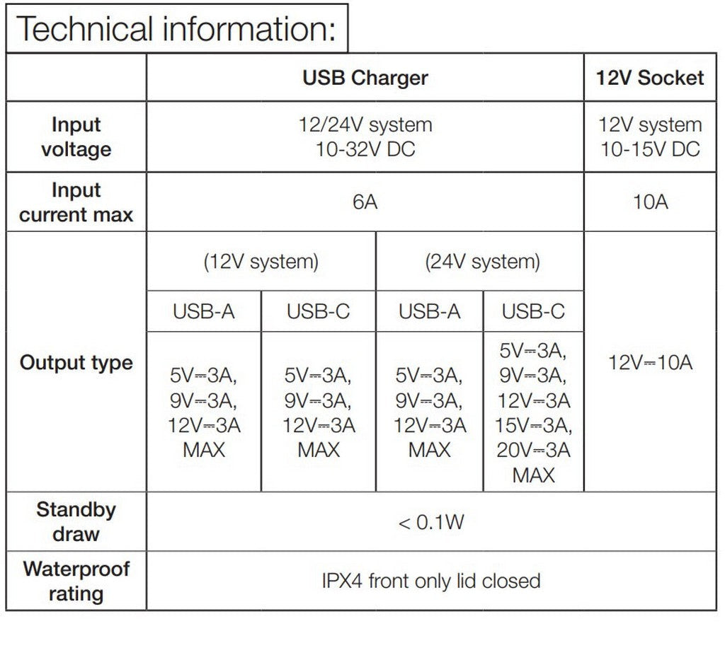 Grâce à son adaptateur universel USB-A et USB-C, vous pouvez charger jusqu’à deux appareils simultanément avec une puissance rapide allant jusqu’à 60 W par port, et une puissance totale de 120 à 150 W, le tout via une prise 12 V classique. Les capuchons à ressort restent fermés hermétiquement, protégeant les ports des intempéries.